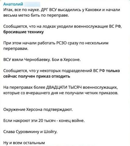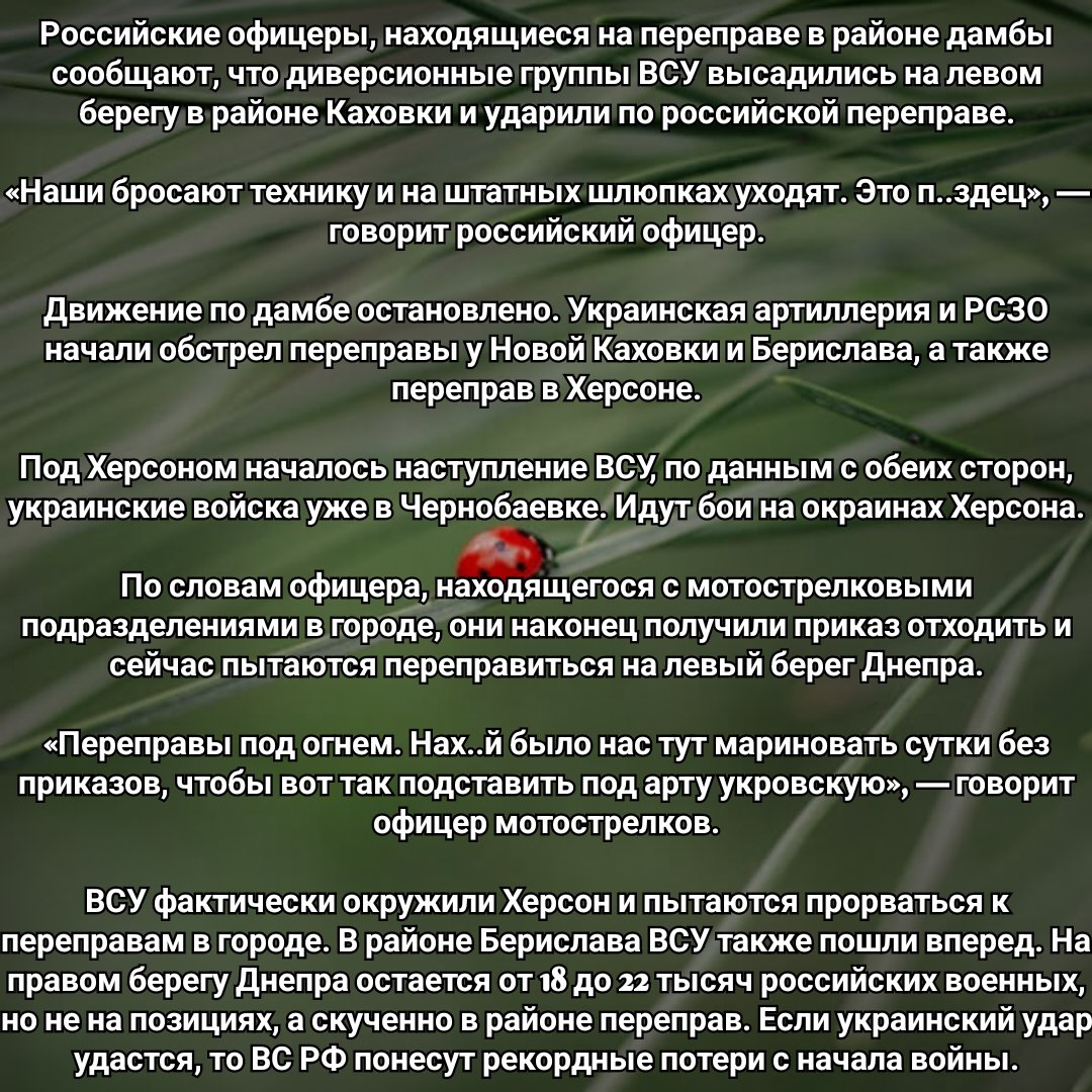 Наверное, ясность в этот вопрос будет внесена в ближайшие несколько дней, но очевидно, что заявленная численность войск противника на правом берегу просто не могла уйти оттуда за два или три дня. Отсюда следует, что часть войск, в том или ином виде, еще остается на правом берегу, а часть – уничтожена нашими военными. Собственно говоря, это подтверждают и сами бойцы ВСУ , чьих записей и видно уже предостаточно.