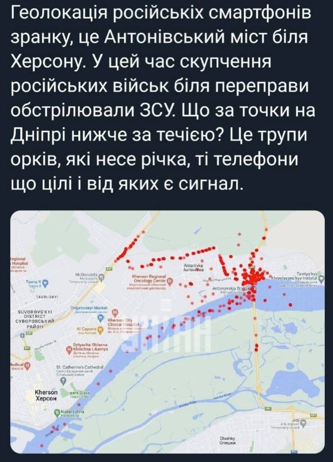 По крайней мере, в Сети появилась карта, на которой отмечено место положение мобильных телефонов оккупантов. Как и следовало ожидать, наибольшая их концентрация – перед переправами, но есть в ней и определенный нюанс. Наверное, каждый его сможет рассмотреть самостоятельно.