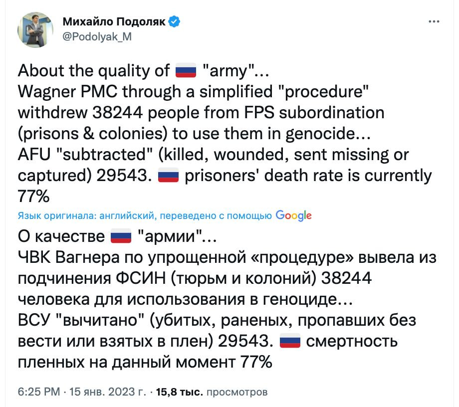 «ВСУ «сняли с учета» (убитые, раненые, пропавшие без вести или пленные) 29 543 (из бывших заключенных россиян). «Могилизация» российских «зеков» сейчас — 77%», — акцентировал Подоляк.