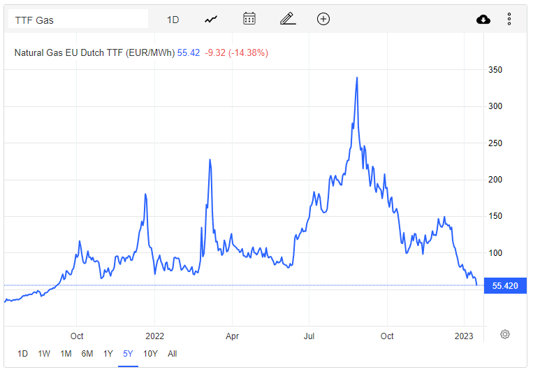 А тем временем, ситуация с газом в Европе, показывает все новые сюрпризы. Так сегодня цена газа в в Нидерландах и Великобритании упала до полуторагодового минимума. Сейчас он торгуется в диапазоне 53-54 евро за мегаватт/час и имеет тенденцию к дальнейшему понижению. Выглядит это так: