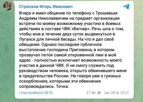 Он отметил, что накануне пообещал приехать в Луганск, чтобы обсудить возможное вступление в организацию. Тем не менее последнее заявление основателя ЧВК Евгения Пригожина «полностью исключает возможность участия в компании», добавил Стрелков.