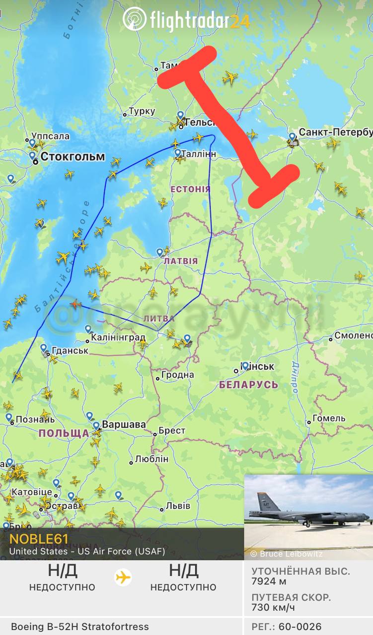 Вчера стратегический бомбардировщик B-52 США в сопровождение истребителей НАТО в ходе учений подошел на предельно близкое расстояние к Санкт-Петербургу, зайдя в Финский залив имитировал удар по РФ, после чего развернулся и ушел в сторону Эстонии.