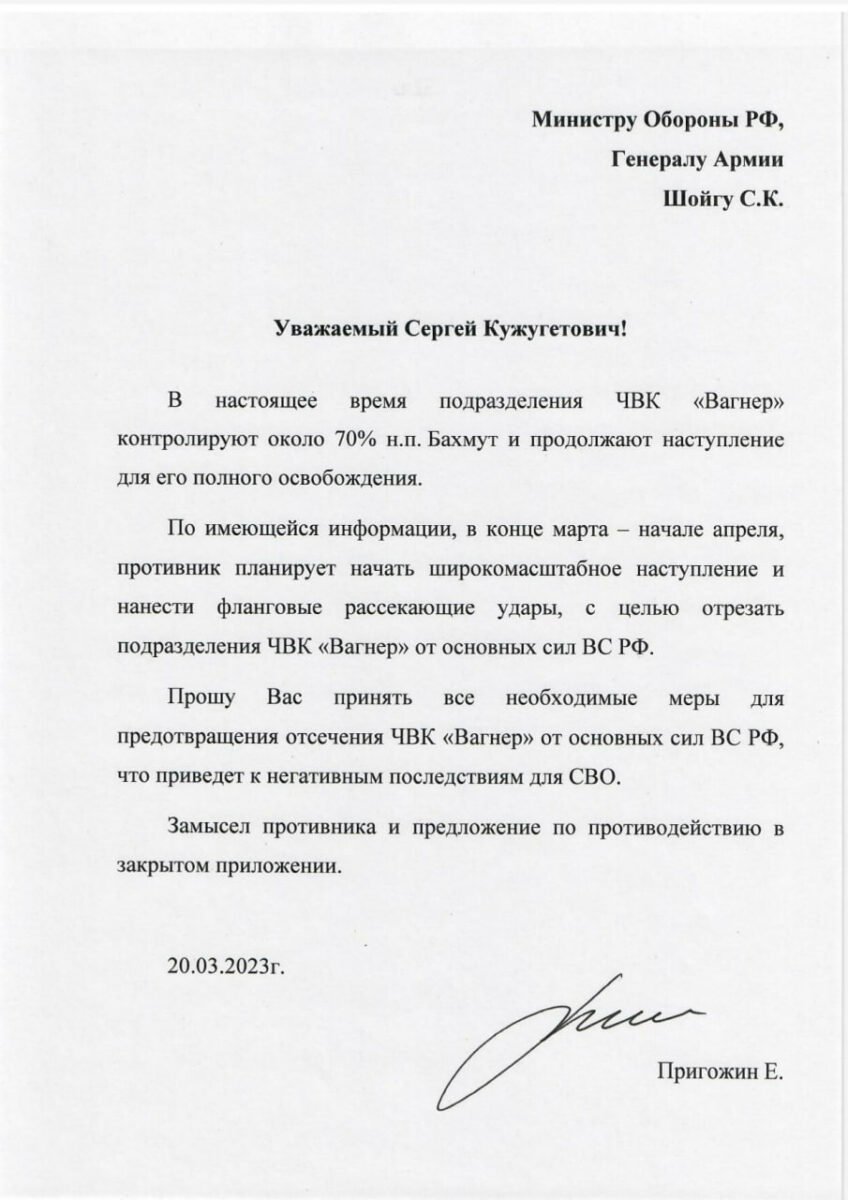 «Прошу вас принять все необходимые меры для предотвращения отсечения ЧВК «Вагнер» от основных сил ВС РФ, что приведет к негативным последствиям для «СВО», — говорится в письме.