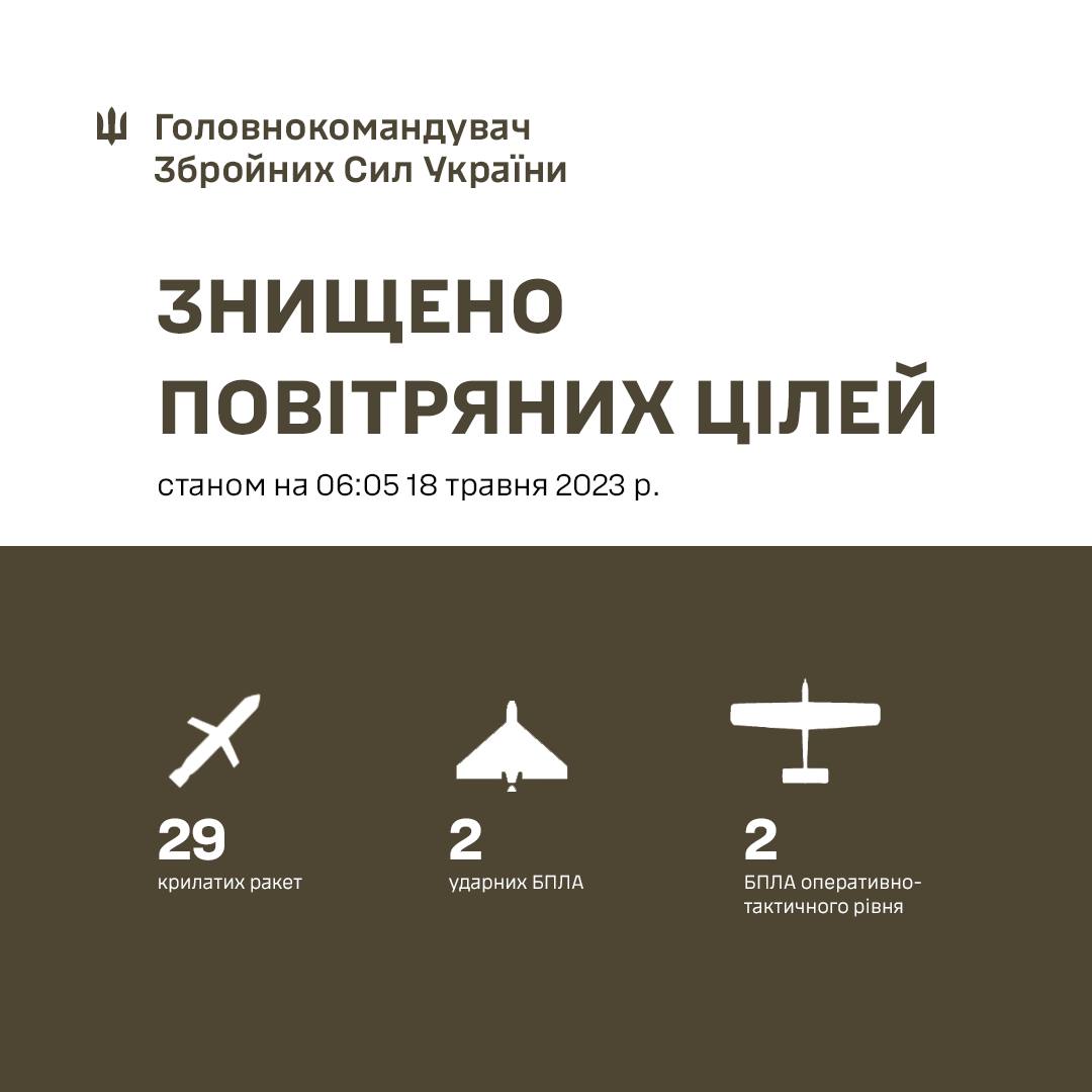 Силами и средствами противовоздушной обороны Воздушных сил, во взаимодействии с другими составляющими Сил обороны Украины, уничтожено 29 крылатых ракет. Также сбиты два ударных БпЛА «Shahed-136/131» и два разведывательных БпЛА оперативно-тактического уровня.