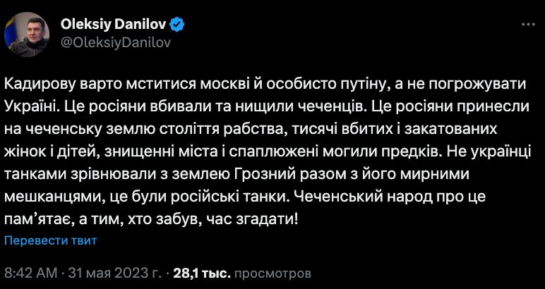 "Кадырову стоит мстить Москве и лично Путину, а не угрожать Украине. Это россияне убивали и уничтожали чеченцев. Это россияне принесли на чеченскую землю века рабства, тысячи убитых и замученных женщин и детей, уничтоженные города и оскверненные могилы предков", - указал Данилов в своем Twitter-аккаунте.