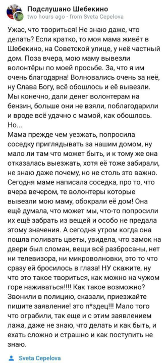 По словам женщины, после этого соседка написала ее маме о том, что те самые волонтеры, которые занимались эвакуацией, обокрали ее дом.