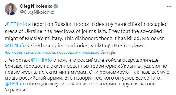 «Репортаж TF1Info о том, что российские войска планируют уничтожить еще больше городов на оккупированных территориях Украины, пробивает новое дно журналистики», – заявил он.