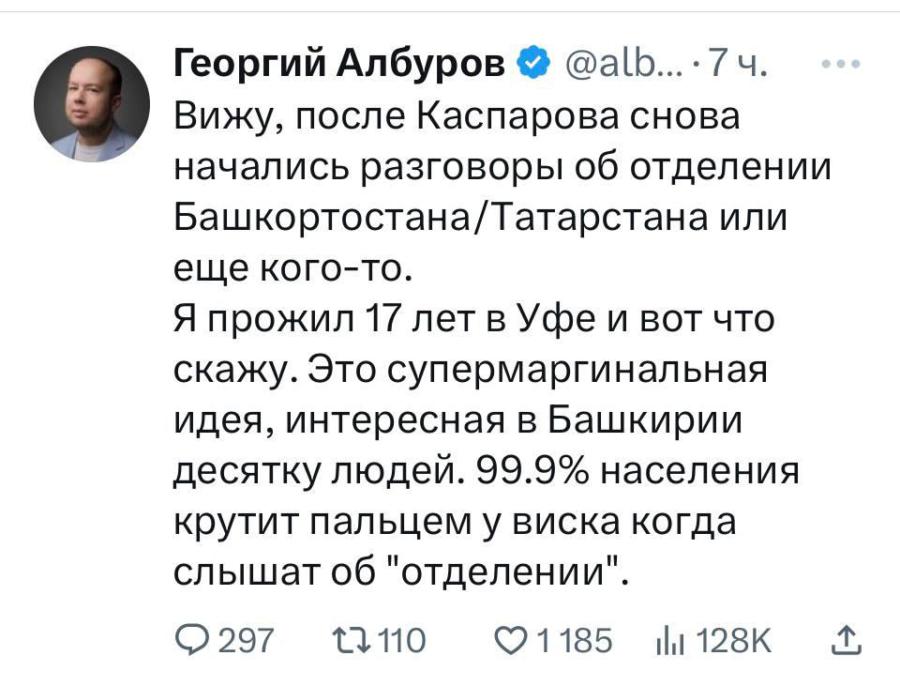 Вот, вслед за Певчих, высказался за сохранение контуров концлагеря "Россия" и уроженец Уфы и бывший глава ФБК Албуров.