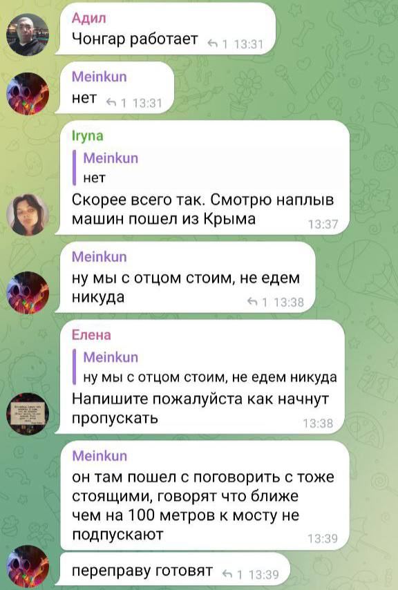 Между тем в местных чатах отмечают, что проезд через Чонгар вроде бы был закрыт – и пока одни заявляют, что располагают информацией о возобновлении проезда, другие утверждают, что слышали от оккупантов, что проезда не будет как минимум в течение суток. Тех, кто планировал следовать через Чонгар, как пишут люди, заворачивали и советовали ехать через Армянск.