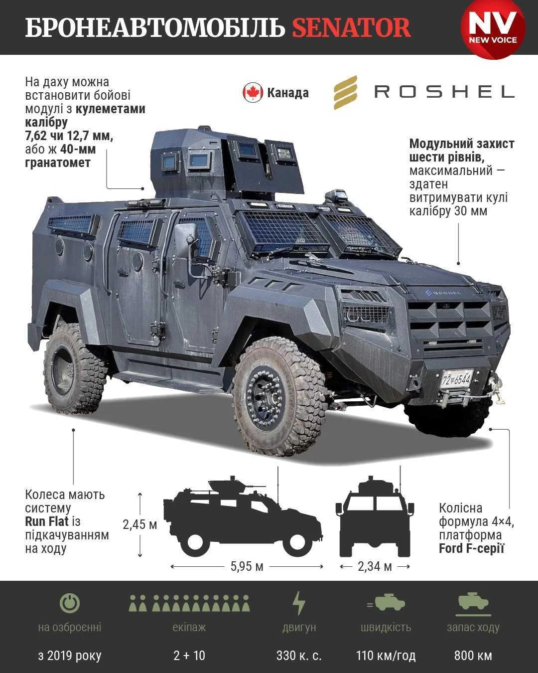 Добавим, что производит бронеавтомобили Senator - канадская компания Roshel Defence Solutions. На вооружении канадской армии они состоят с 2019 года. Длина БТР Senator - 5,95 м, ширина - 2,34 м, высота - 2,45 м, мощность двигателя - 330 л.с., скорость - 110 км/ч, запас хода - 800 км. Экипаж этих БТР состоит из двух человек, они могут перевозить до 10 десантников.