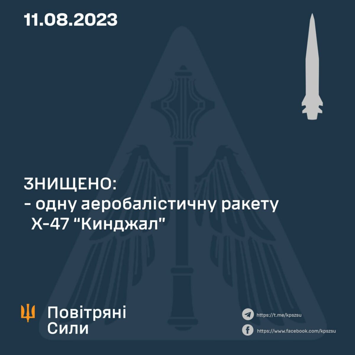 Россия утром 11 августа выпустила 4 аэробалистические ракеты «Кинжал» по территории Украины. Силы ПВО сбили одну воздушную цель, сообщило Командование Воздушных сил.
