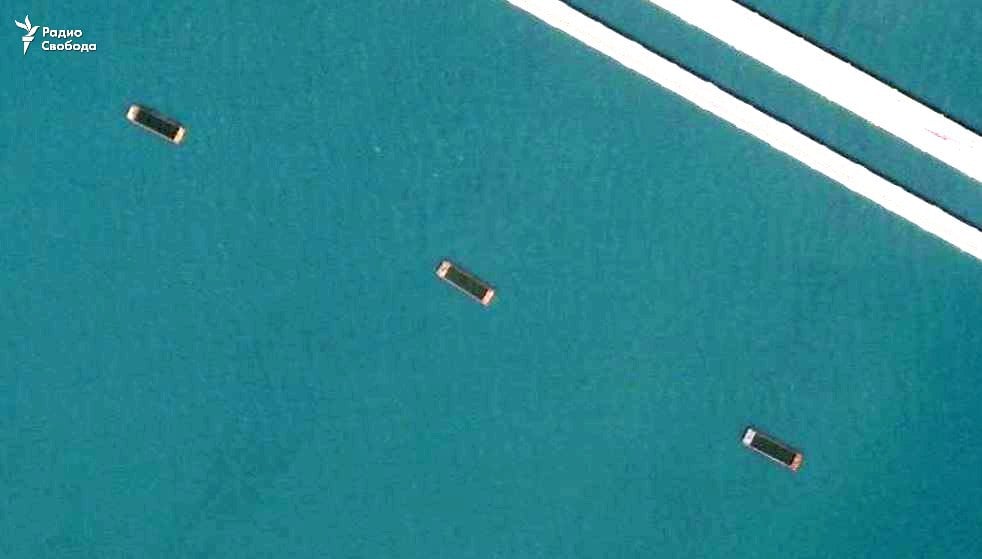 Журналисты отмечают, что баржи не «затоплены», а, вероятнее всего, закреплены якорями на одном месте.