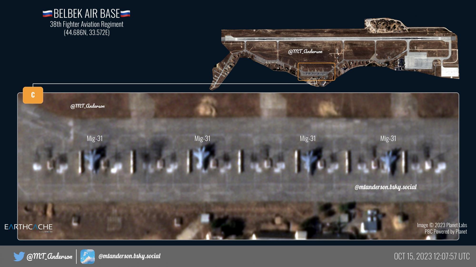 19 октября OSINT-аналитик MT Anderson опубликовал спутниковые снимки аэродрома Бельбек возле временно оккупированного Севастополя, датированные 15 октября. Согласно обнародованным снимкам, на аэродроме находится по меньшей мере четыре истребителя МиГ-31, а также рассредоточены истребители Су-27 и Су-30.