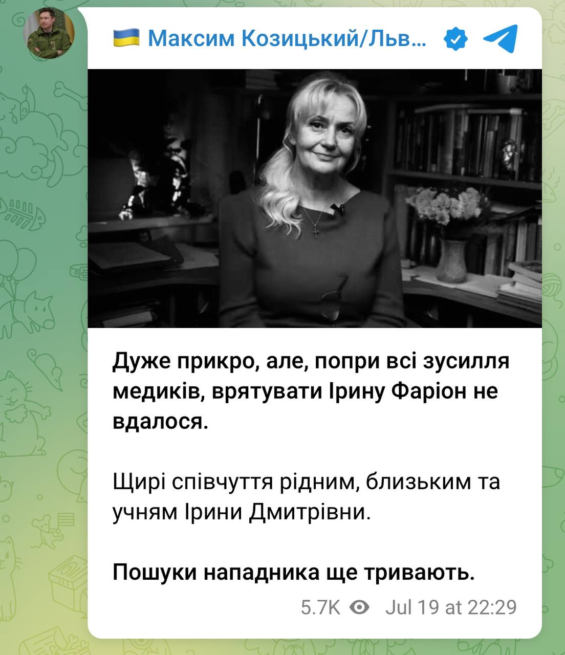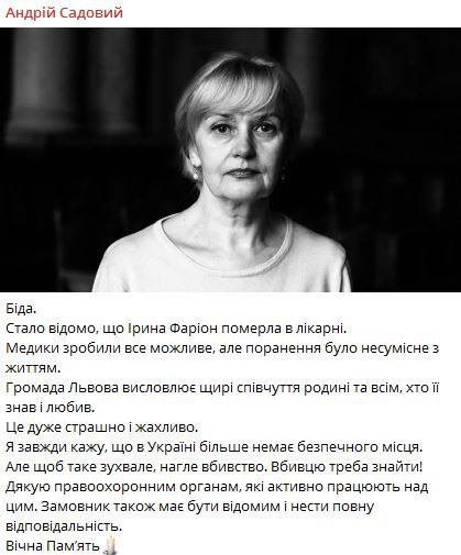 Информацию о смерти Фарион после покушения подтверждают глава львовской ОВА и мэр Львова