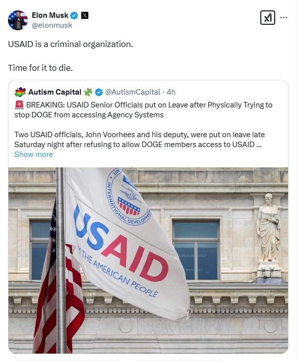 Миллиардер и союзник президента США Дональда Трампа Илон Маск заявил, что USAID - Агентство США по международному развитию - должно "умереть", поскольку является якобы преступной организацией. Он написал об этом в отдельной публикации в социальной сети X (Twitter), отдельно обвинив USAID в финансировании исследования биологического оружия, в частности COVID-19 в другой публикации в X.