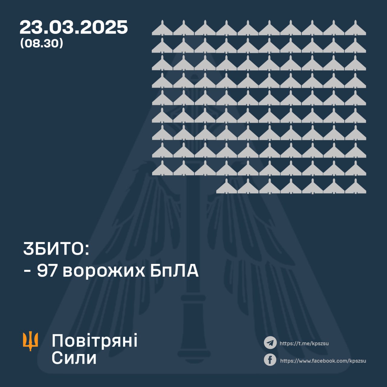 По данным на 8.30, авиация, зенитные ракетные войска, подразделения радиоэлектронной борьбы и мобильные огневые группы ВСУ обезвредили 97 беспилотников, еще 25 БПЛА были сбиты с курса (локационно потеряны) без негативных последствий. Противовоздушная оборона была задействована по всей стране, говорится в сводке.