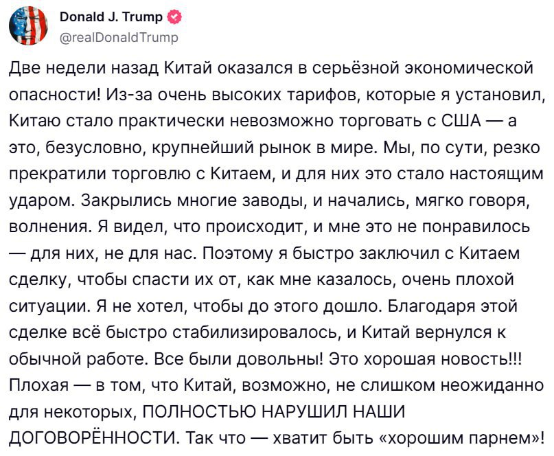 "Я видел, что происходило, и мне это не нравилось... Я заключил быструю сделку с Китаем, чтобы спасти их от того, что, как я думал, будет очень плохой ситуацией, и я не хотел, чтобы это произошло. Благодаря этой сделке все быстро стабилизировалось, и Китай вернулся к обычному бизнесу. Все были счастливы! Это хорошие новости! Плохие новости в том, что Китай, возможно, неудивительно для некоторых, полностью нарушил свое соглашение с нами. Вот вам и мистер Хороший Парень!" – написал Трамп.