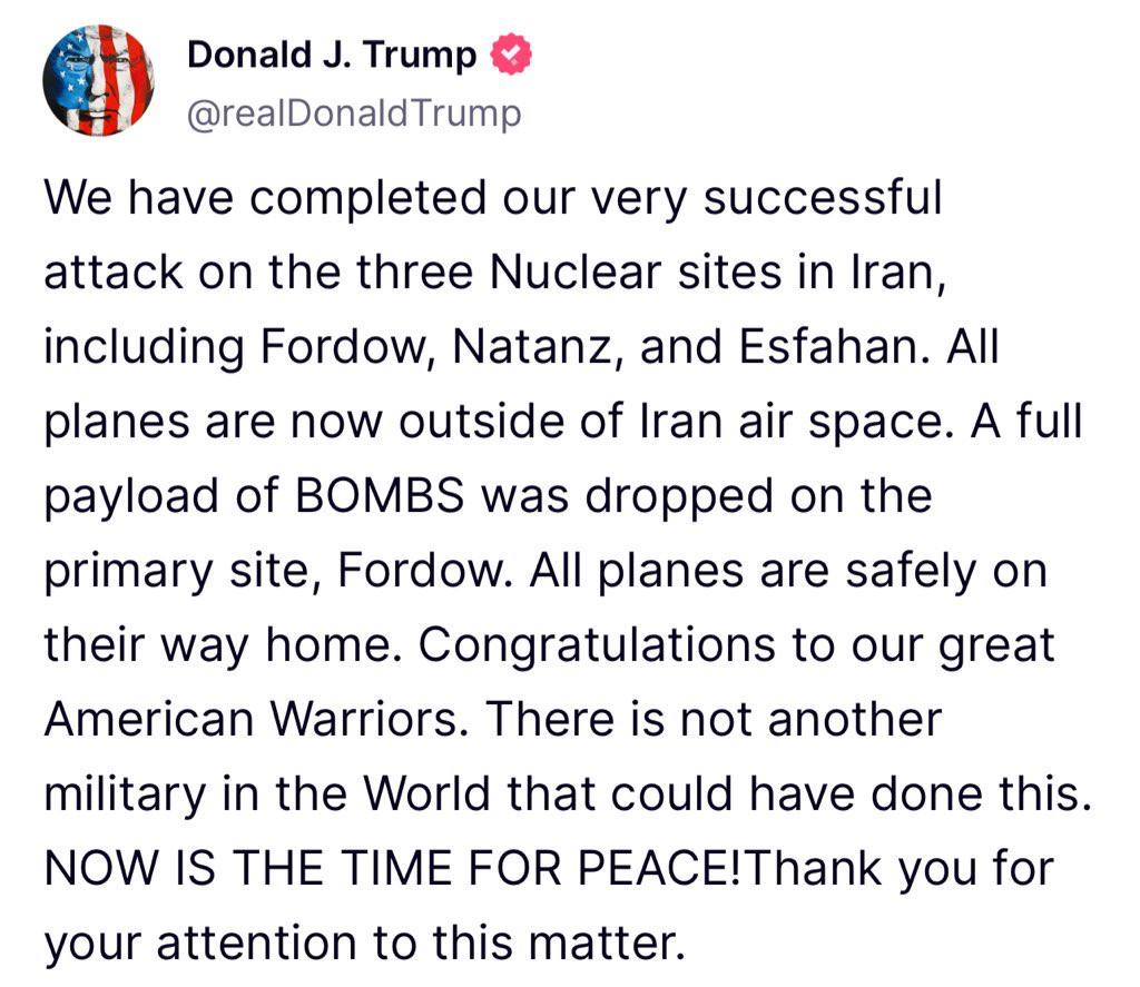 "Мы завершили нашу очень успешную атаку на три ядерных объекта в Иране, включая Фордо, Натанз и Исфахан. Все самолеты сейчас находятся за пределами воздушного пространства Ирана. На основной объект, Фордо, был сброшен полный боезапас бомб. Все самолеты благополучно возвращаются домой. Поздравляем наших великих американских воинов. В мире нет другой армии, которая могла бы сделать это", – заявил американский президент в своей соцсети Truth Social.