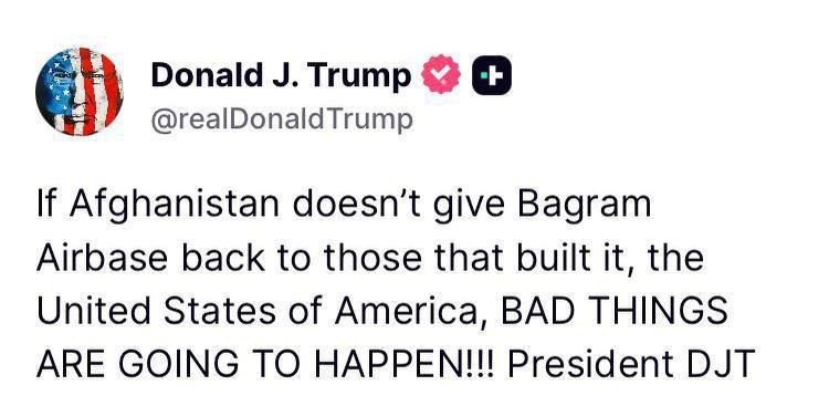 "Если Афганистан не вернет авиабазу Баграм тем, кто ее построил, то есть Соединенным Штатам Америки, то произойдут плохие вещи", – написал Дональд Трамп.