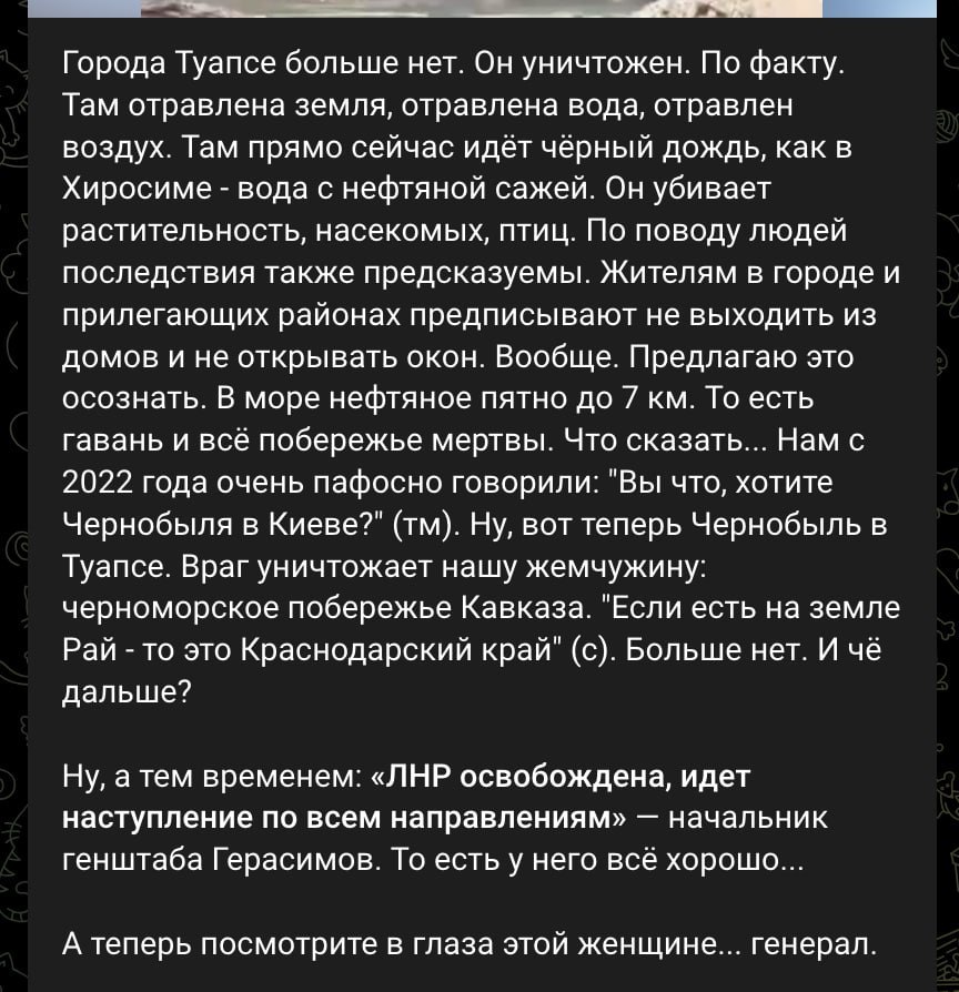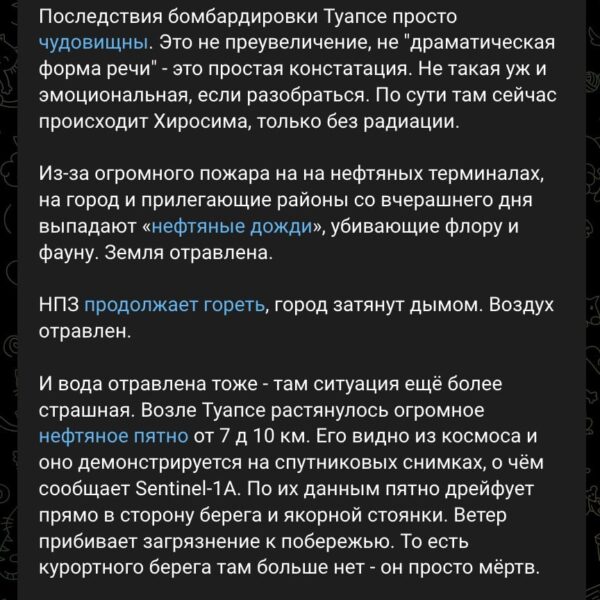 А ведь может случиться так, что ответ на такое, весьма сомнительное предлоение, может прозвучать и так: «Москва? Какая москва? Нет никакой москвы». Перебор? Но вот уже Новороссийск ощутил что-то такое, что пришлось пережить тому линкору, а прямо сейчас из Туапсе пишут о том, что города уже нет.
